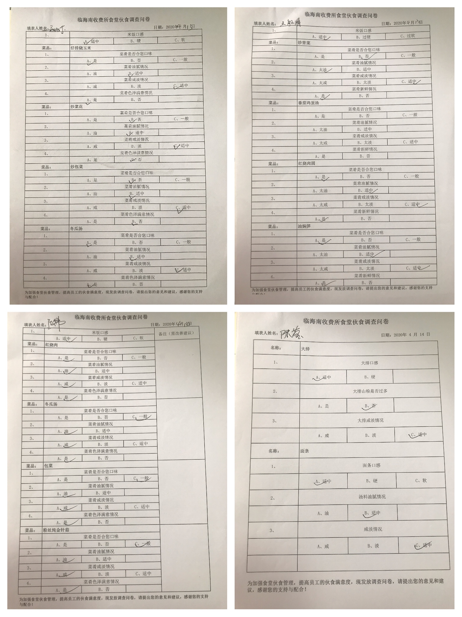 為了提高食堂滿意度,該所菜肴口味、油膩度、咸淡、色澤等方面制定調查問卷,大家真實客觀地表達各自的想法和建議。問卷調查采用當班用餐人員實名填寫問卷調查表的形式進行,通過收集的問卷每天中午定期召集食堂人員,反饋前一天的調查結果,根據員工的反饋建議,討論制定整改措施,確保將員工的意見及建議落到實處。除此之外,每逢傳統佳節,定制相應的節日菜譜,保證員工在站所也能感受到節日的喜慶和家的溫馨。