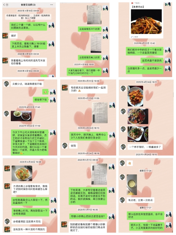 今年4月中旬,所務陳瑩利用微信建立了食堂交流群,經常在群里上傳網上、廚房APP下載的一些簡單又美味的家常菜制作方法結合食堂人員的特長,針對季節變換,合理調整飲食,做到葷素搭配、飯菜每班一日三餐不重樣等要求提前列出每周菜譜,要求食堂人員根據菜譜,每周針對創新家常菜,提前準備少量食材,精心燒制,待嘗試滿意后供應。