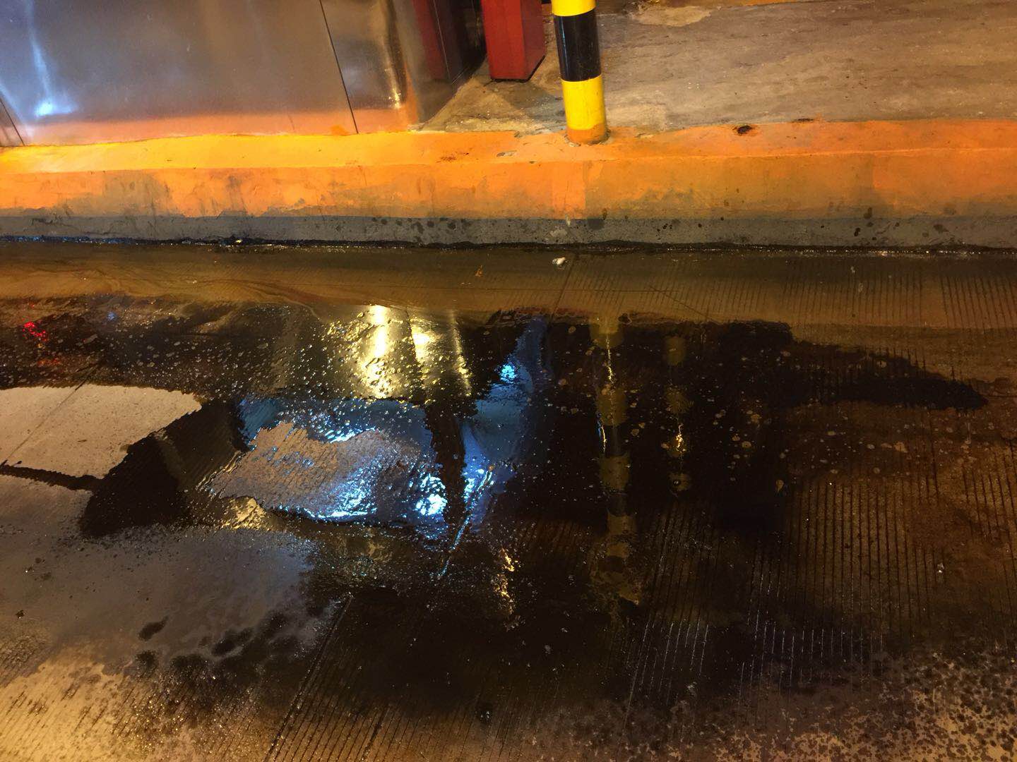拖車很快到達車道,經初步檢查后確認是傳動軸故障,液壓油漏了一地。十分鐘后,車子拖離了車道。由于車子漏的液壓油較多,為避免后來車輛在車道內打滑,收費員胡德金和施救人員嘗試用水沖,但發現效果不好,又用洗衣粉沖了一遍確認不會滑后再開通車道。沖洗好車道兩人手上的機油味久久不能去除。