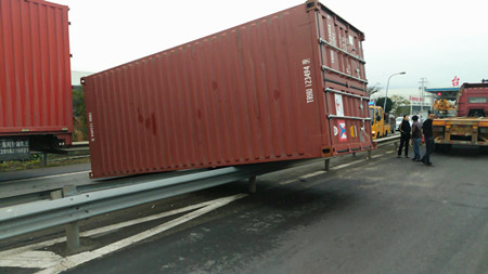 12月15日10:10分左右,一輛車牌為浙B88C06的集裝箱車在臺州南副站選擇出口車道時,因變道和出口運載汽車的長掛車發生碰撞,使得未鎖牢的集裝箱箱體甩落下來,砸到護欄及進口一輛正在通行的貨車車頭,造成護欄變形、貨車車頭受損嚴重,所幸無人員受傷。
