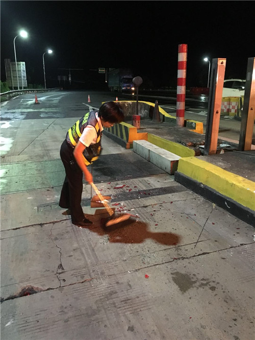 為了保暢通,收費班長讓司機拍照后開到外面等待處理,車輛駛離車道后,發現稱臺上罩殼跟防護欄被擠彎,地上剩下一堆玻璃碎片殘渣。班長正在處理相關事宜時,發現收費員張小芬已經麻利的在車道上清理殘余碎片,不多久就恢復了超寬車道通行。