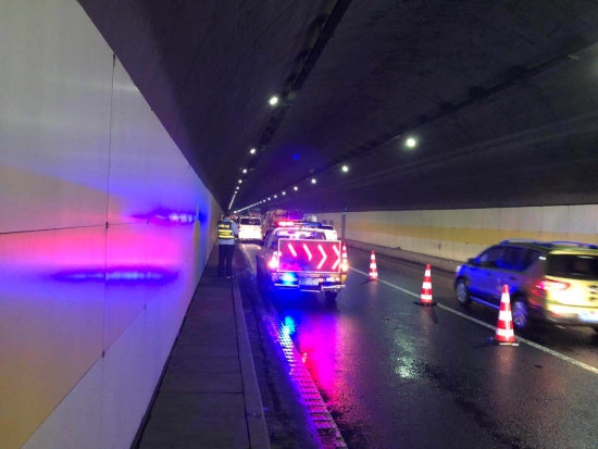 7月14日19時(shí)22分,中控員朱金飛發(fā)現(xiàn)黃土嶺寧向隧道1000米快車道處有車拋錨。立刻呼叫執(zhí)勤隊(duì)前往處置,隨即更改快車道交通信號(hào)。 執(zhí)勤隊(duì)迅速出警,幾分鐘后就趕赴事故現(xiàn)場(chǎng),發(fā)現(xiàn)一輛白色面包車撞在隧道內(nèi)右側(cè),車輪箍嚴(yán)重受損,卡在護(hù)溝里,所幸無(wú)人員受傷。執(zhí)勤隊(duì)進(jìn)行提前預(yù)警,預(yù)防二次事故的發(fā)生,并呼叫高速施救車輛支援,幾分鐘后施救車抵達(dá),事故車輛安全拖離隧道,僅僅十分鐘,交通就恢復(fù)暢通。