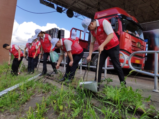 圖為志愿者合影 活動現(xiàn)場,身著紅馬甲的志愿者們,拿著垃圾夾、垃圾袋、掃把、畚斗等工具,重點清理收費站內(nèi)外廣場的煙頭和白色垃圾。由于上下高速時有不少司乘人員直接把垃圾丟向兩側(cè)邊溝,導(dǎo)致收費所兩側(cè)邊溝垃圾較多。盡管天氣炎熱,但志愿者們自行分組,三人一組、五人一隊,充分發(fā)揮不怕苦不怕累不怕臟的精神,并互相配合集中對一些死角進(jìn)行清理。
