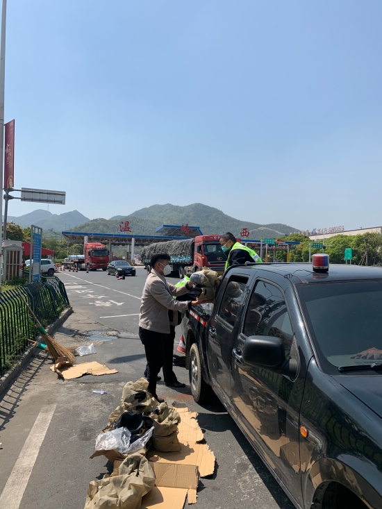 執(zhí)勤隊員們立即做好現(xiàn)場預(yù)警工作,擺好隔離錐,拿出掃帚快速清理。這時,肇事司機發(fā)現(xiàn)貨物丟,在溫嶺西收費站出口等待。隊員趕緊清完現(xiàn)場,載著貨物直奔溫嶺西收費站