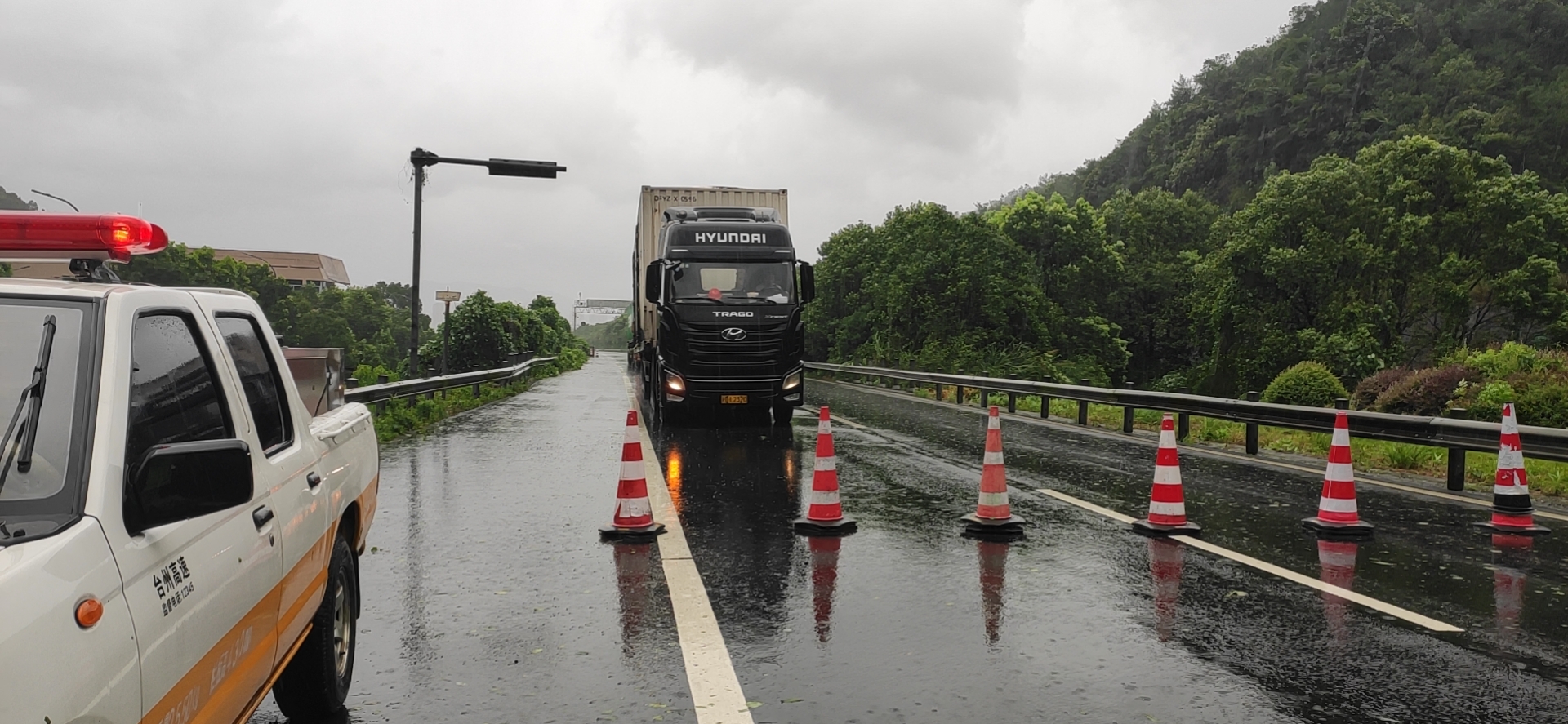 08:12分,接溫州交警通知,受臺風影響,高速上很多車輛發生側翻事故,要求隊員們在溫向隧道口進行封道,隊員們接警后立即在洞口卡口預警。