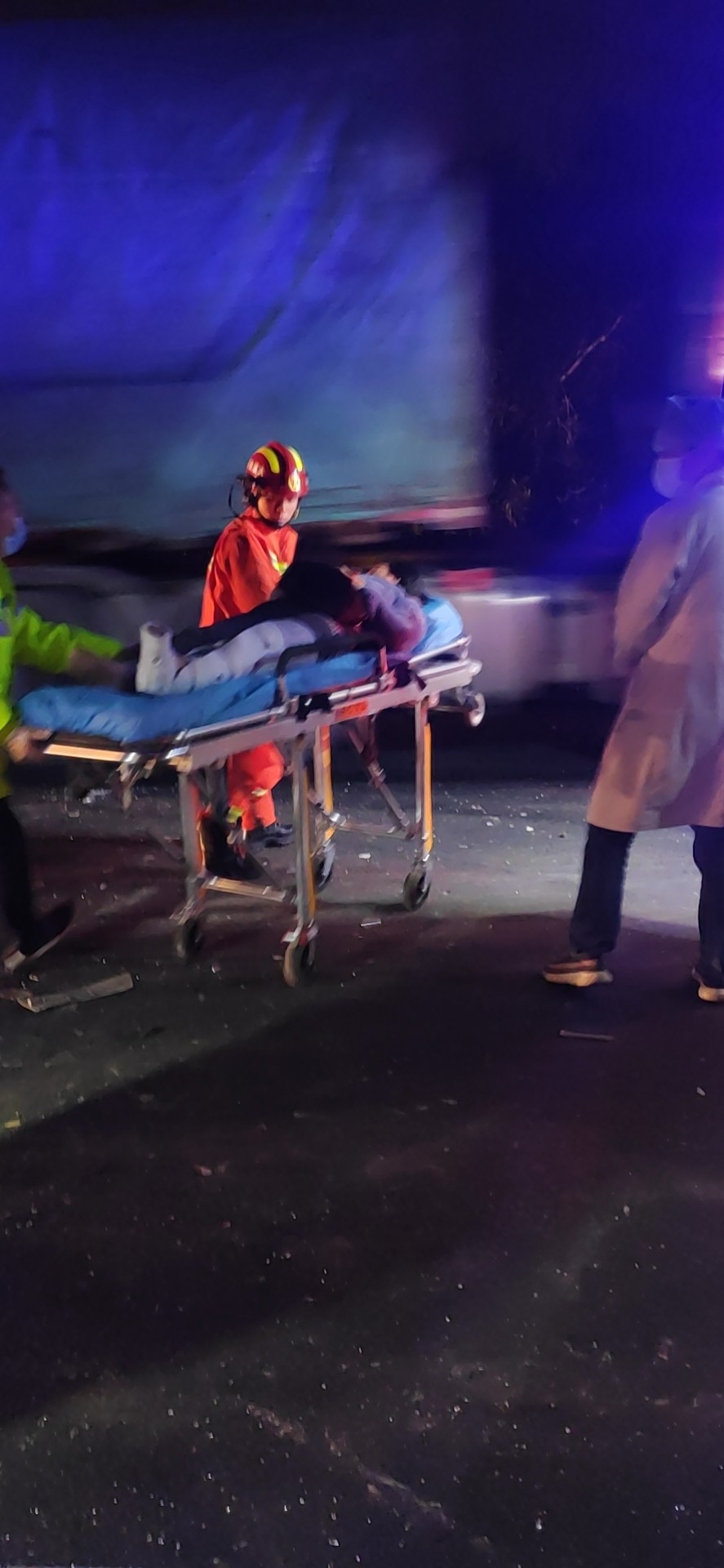 21:50巡邏車和消防車同時到達現場,隊員陳幸飛快的跑下來,以百米沖刺的速度做好巡邏車的安全措施和預警工作,有3人受傷,事故車頭已嚴重變形,一名女性腰部受傷坐在地上,語速正常,思維清晰。還有二名人員被卡在駕駛室,消防隊員正在查看現場準備施救,受傷人員哭爹喊娘嚎聲不斷,由于救護車還沒達到現場,陳幸在事故車后方硬路肩上維護秩序,防止車輛占道,并同時迎接救護車,湯寧光則在維護現場秩序,阻止其他司機圍觀影響救援。 22:00第一輛救護車到達。醫護人員準備擔架,另一名醫生去詢問坐在地上的受傷人員,由于車頭嚴重變形,司機與鄰座的人都被卡在駕駛室,經過消防員的救援,受傷最嚴重的司機首先被救了下來,在被救下的那刻暈了過去,醫護人員立該把傷員抬上救護車,緊接著消防員救下第二位被卡傷員,第二輛救護車帶著傷員離開,最后一輛救護車卻遲遲沒到,經聯系監控中心后得知救護車已上高速,但因后方車輛太多,救護車和拖車都被堵了,經和臺州高速交警協商后,最后清理一個車道讓救護車和拖車先開上來,巡邏車去事故車后方預警,22:30救護車帶走最后一名傷員,事故車被拖走,路面恢復正常通車。