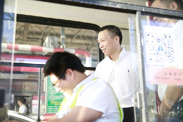 圖為集團(tuán)副董事長(zhǎng)、總經(jīng)理張建平在溫嶺西收費(fèi)崗?fù)z查
