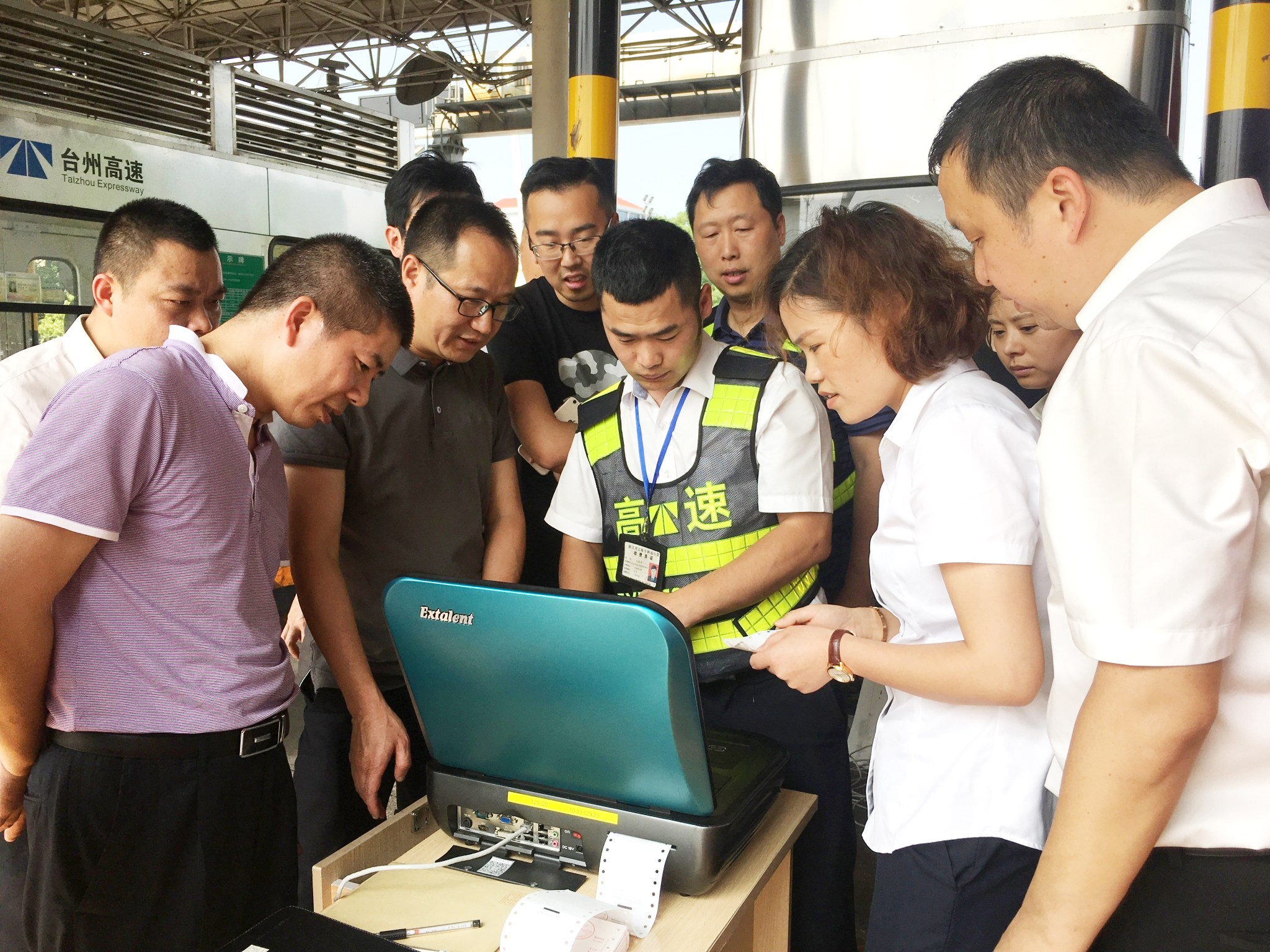 臺州南收費所人員學習使用便攜式收費機,公司副總經理章海峰到場指導