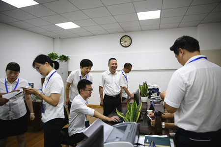 圖為集團副董事長、總經(jīng)理張建平在臨海股權(quán)收購點檢查工作人員業(yè)務操作