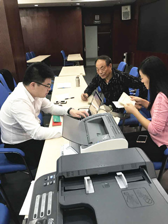 戴著一副黑框眼鏡,憨實魁梧的身形,說話輕言慢語。據說,某天下班后,還坐在椅子上打電話,一臉溫柔,竊竊私語,同事一直以為他在談戀愛,這打完了電話,才知道是接到股東的電話了,跟對方在解釋股權收購政策呢。 在股權流動收購點,小李是電腦操作人員,所以也不大參與解說工作。只是那天正好一位阿婆坐在了電腦對面,說話之間才知大字不識,是聽鄰居說的,就自己摸到這里了。正好手里也空了,李騰飛頓頓身子,放松下來,以黃巖特有的吳言儂語跟阿婆解釋了十幾分鐘,果然,白凈的臉上是一臉的和氣,沉穩又實在,確實是傳說中的暖男一枚呀。末了,幫阿婆代簽了字,讓阿婆按了手指印。 但是,在工作的時候,小李讓我們見識到了“騰飛”的效果。流動點只設一臺筆記本電腦,線上操作都歸他,在大溪鎮政府,來的股東有百十號,流動小組包括駕駛員何杰靚迅速開展了流水作業。此時此刻,小李那一雙肥白的大手在小巧的鍵盤上十指翻飛,靈活敏捷,操作如行云流水,打印機刷刷地響,不停飛出一份份協議,傳到下一個工作人員這里。這才知道,每一個人的名字都是名副其實的,“騰飛”的含義是在這里體現的呀。 鄭蔚