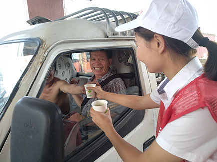圖為志愿者合影 志愿者們兵分三路,一路在外廣場(chǎng)對(duì)滯留車輛進(jìn)行文明勸導(dǎo),一路拿著垃圾袋和撿拾工具沿收費(fèi)區(qū)域收集垃圾,另一路則在安全島上向過往的司乘人員宣傳夏日行車安全知識(shí),同時(shí)提供礦泉水、冰鎮(zhèn)綠豆湯,發(fā)放清涼油、風(fēng)油精等防暑降溫用品,不僅為司乘人員提供熱情周到的服務(wù),還讓過往司乘人員在炎炎夏日真切感受到一絲清涼和一份關(guān)心。 該所通過開展一系列的志愿活動(dòng),促進(jìn)了收費(fèi)員與司乘人員之間的溝通交流,拉近了彼此之間的距離,贏得了過往司乘人員的好評(píng),塑造了良好的窗口形象,為臺(tái)州市創(chuàng)建全國文明城市貢獻(xiàn)力量。 鄭瑛芝