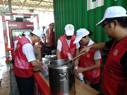 圖為志愿者給養(yǎng)護(hù)工人送上綠豆湯