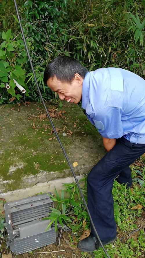 9月23日早上8點45分,中控員發現大溪嶺隧道北高位水池圖像模糊,照明燈不亮了。 為保障隧道消防安全,中控員對消防水池的水位需時時關注,萬一水池漏水無法及時查看,如遇火災,消防水供應不上,后果不堪設想。隊長意識到事情的嚴重性,即刻安排電工湯寧光和陳幸趕往北面山上的高位水池位置。初秋的山上植物茂盛,原來通往水池的小路早已淹沒在雜草間,隊員們提著工具,憑著記憶找小路,單手撥開雜草往山上走,到達高位水池之后,他們分工協作,一邊檢查線路,一邊抬開井蓋并下到水池檢查照明燈,經過檢查后發現只是線路有點松動,陳幸馬上對線路進行加固。