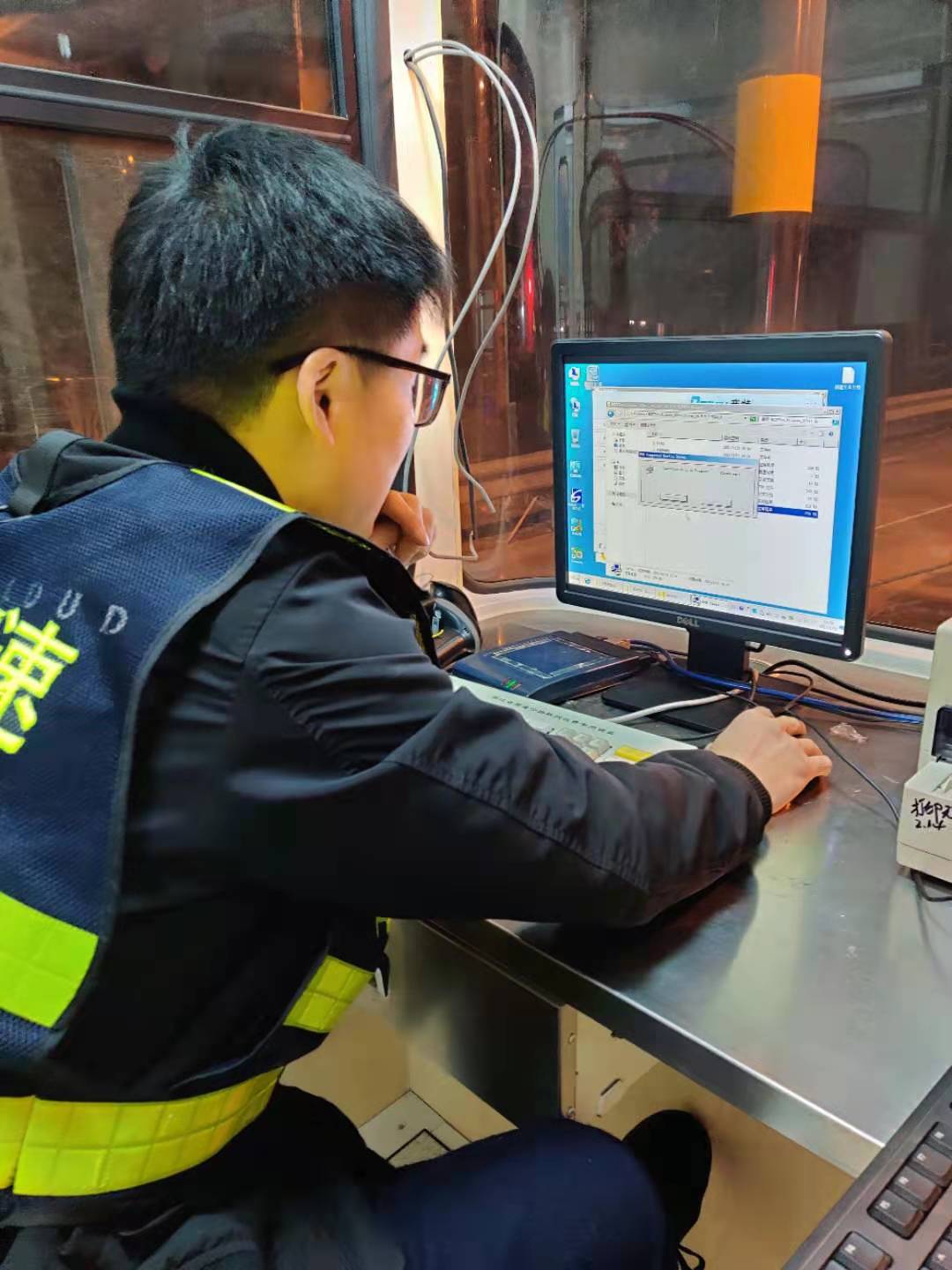 22日一早,中心電工配合廠家人員在車道繼續查線、接線,安裝崗亭的基礎設備,系統員則在機房負責安裝新電腦的收費系統及相關設備驅動。大家各司其職、各盡其責,僅一天時間就將近百根線纜一一對應并成功與外圍設備對接,與此同時,系統員也恢復了原電腦中的數據并成功導入到新電腦中,避免了數據中斷。在修復過程中,搶修人員也曾遭遇各種困難,有些設備安裝需要專用工具,部分零散配件、電源等一般商鋪都沒有供應,但這些并沒有難倒他們,而是利用各自資源,跑遍了市區的大街小巷,或借或買,最后都被一一解決。