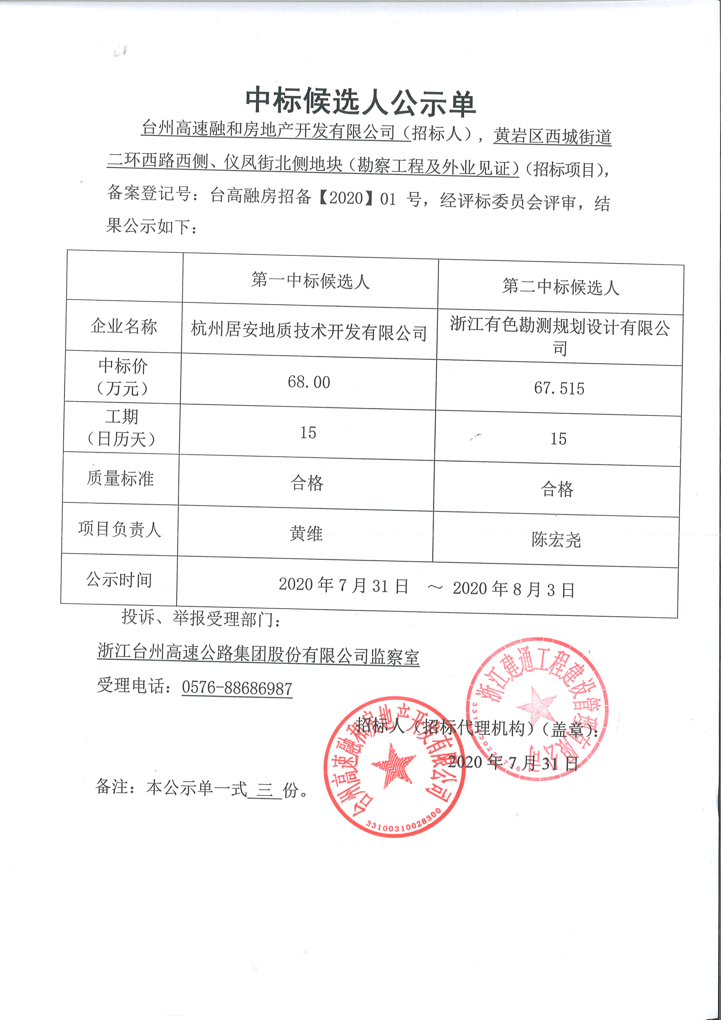 黃巖區西城街道二環西路西側、儀鳳街北側地塊(勘察工程及外業見證)中標候選人公示單