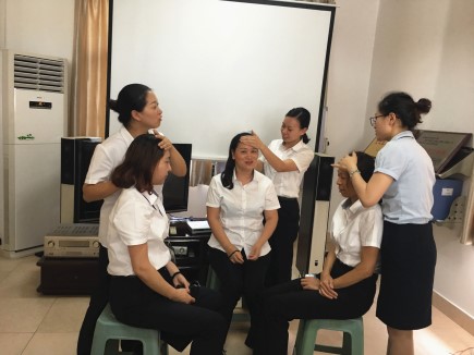 課堂中,一位老師為大家講解了“什么是頸椎病”、“頸椎的重要性”、“頸椎病的危害”等有關健康知識,另一位老師邀請現場人員做示范,用專業手法演示如何緩解頸椎亞健康狀態。 在老師的理論講解和親手示范下,在場人員分成兩組,現學現練,一組人用所學手法演示操作,另一組人坐著感受,老師在旁一一指點不足之處,然后兩組人員互換,交替學習。 此次健康講座不僅僅是紙上談兵,更讓每位員工親自練習操作手法,為今后在做好文明服務收費工作中,如何減緩頸椎疲勞提供了方法。 徐蘇蘇