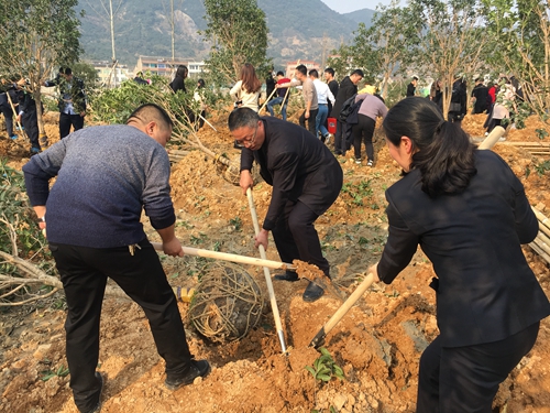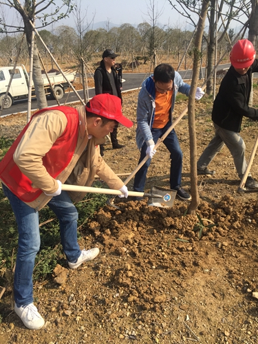 圖為植樹現場 由于此次栽種的樹苗偏大,大家分組合栽樹苗,腳踏泥濘,挖坑、下樹苗、填土、澆水……栽種現場氣氛熱鬧,雖然一身泥巴,大家卻樂此不疲。在近一個小時的共同努力下,分配的樹苗栽植完成,大家還為自己植的樹掛上“樹木領養卡”,在栽種好的樹苗前合影留念,為自己種的樹賦予更多的意義。